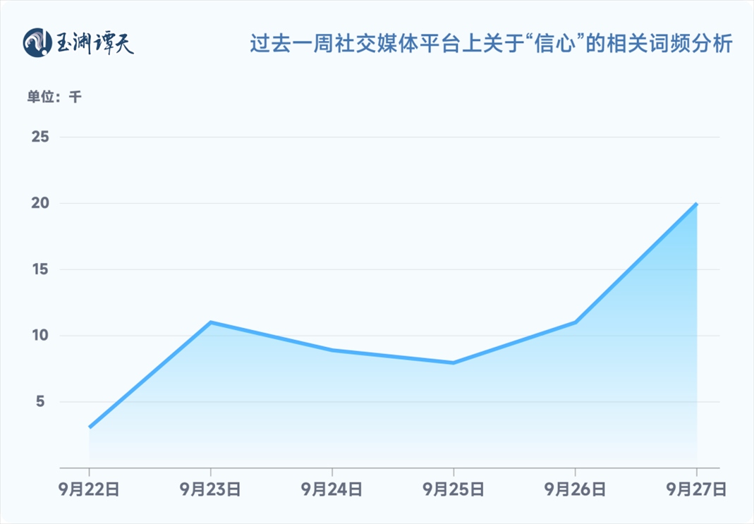 從這張曲線圖上可以看到,輿論場對(duì)“中國經(jīng)濟(jì)”的討論,在過去一周經(jīng)歷了2個(gè)峰值。其中,“信心”這個(gè)詞出現(xiàn)的頻率經(jīng)歷了兩次躍升。
