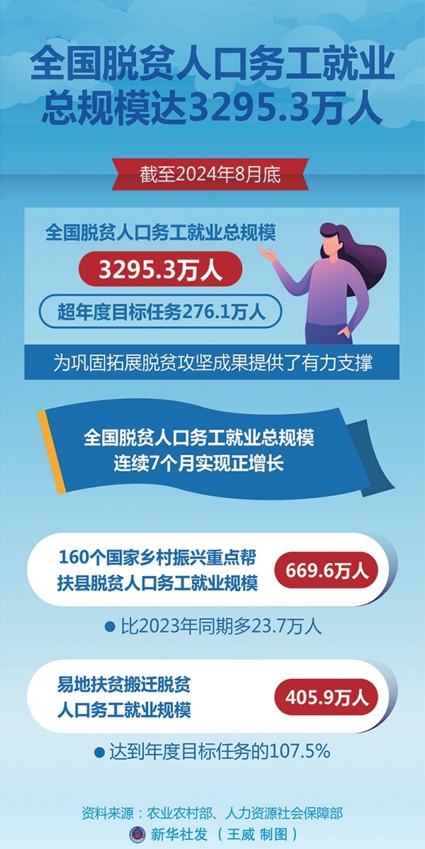 今年以來各級各相關(guān)部門深入開展防止返貧就業(yè)攻堅行動,截至8月底,全國脫貧人口務工就業(yè)總規(guī)模達到3295.3萬人,超年度目標任務276.1萬人,為鞏固拓展脫貧攻堅成果提供了有力支撐。 新華社發(fā) 王威/制圖