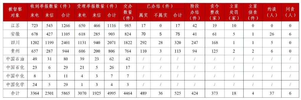 截至10月30日20時(shí),各督察組共收到群眾來(lái)電、來(lái)信舉報(bào)5865件,受理有效舉報(bào)4995件,經(jīng)梳理合并重復(fù)舉報(bào),累計(jì)向被督察對(duì)象轉(zhuǎn)辦4464件。被督察對(duì)象已辦結(jié)或階段辦結(jié)949件,其中立案處罰18家;立案?jìng)刹?件;約談黨政領(lǐng)導(dǎo)干部37人,問(wèn)責(zé)黨政領(lǐng)導(dǎo)干部6人。