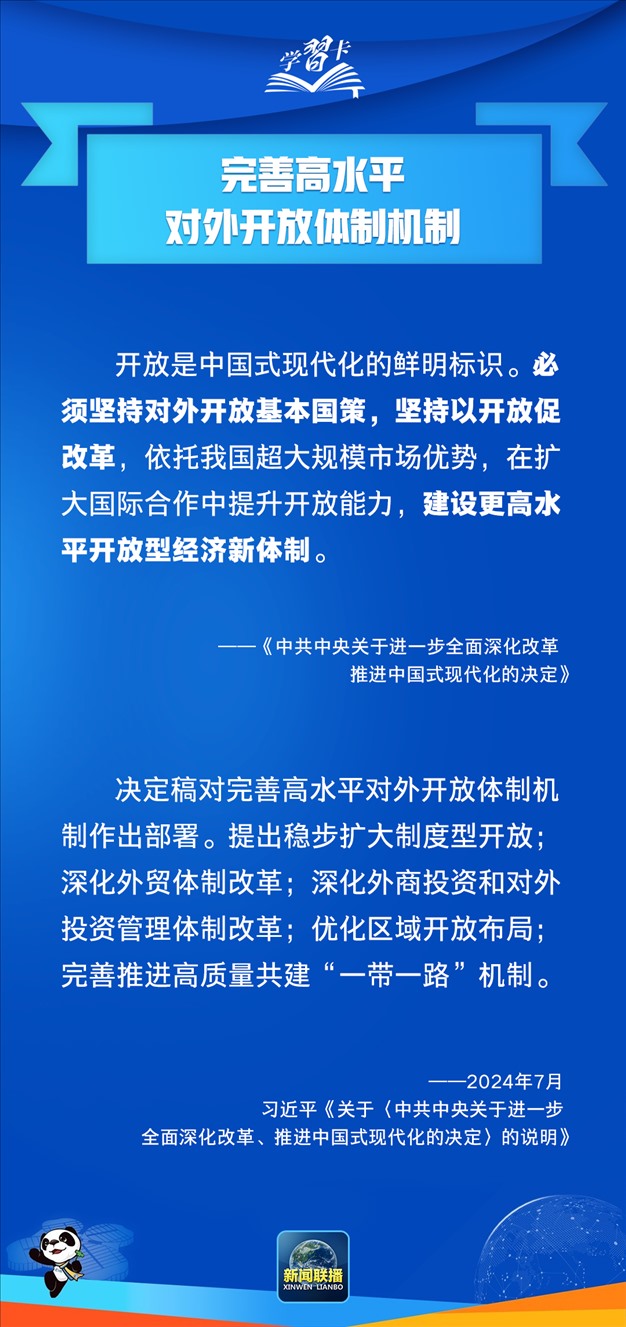 今年7月,黨的二十屆三中全會審議通過《中共中央關(guān)于進(jìn)一步全面深化改革 推進(jìn)中國式現(xiàn)代化的決定》。這份綱領(lǐng)性文件明確提出,“完善高水平對外開放體制機(jī)制”。