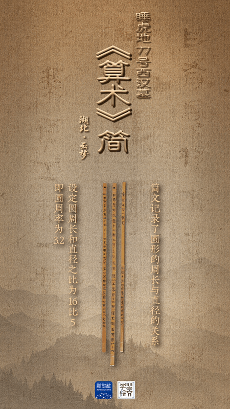 簡牘里的《算術》,是古人科學智慧的精彩呈現。三枚關于計算圓形田地面積方法的西漢簡牘保存完好,為首次公開展出。“有睘將來直十六與五侍之”,睡虎地漢簡中列舉的這道算術題顯示,周長和直徑之比為16:5,即圓周率為3.2,證明秦漢之際已有人認識到比3更精確的圓周率,為出土簡牘所僅見,尤其珍貴。
