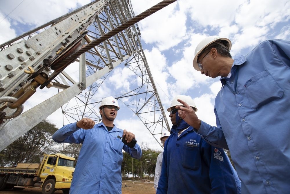 2018年8月7日,在巴西東南部米納斯吉拉斯州阿科斯市附近,巴西美麗山特高壓輸電工程二期第九標(biāo)段項(xiàng)目中方現(xiàn)場施工管理負(fù)責(zé)人(左)在施工現(xiàn)場指導(dǎo)巴方員工。美麗山水電站二期項(xiàng)目是中國國家電網(wǎng)公司首個在海外獨(dú)立投資、建設(shè)和運(yùn)營的特高壓直流輸電工程,也是“特高壓+清潔能源”在拉美的示范工程。