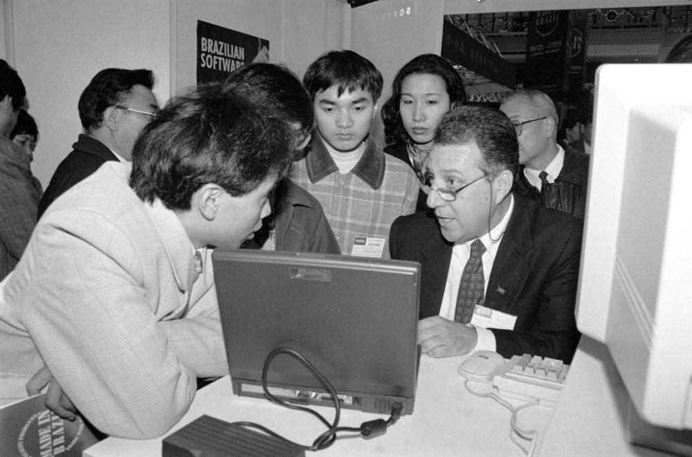 1995年12月14日,巴西外貿(mào)及合資項(xiàng)目洽談會在上海舉行。這是一位參展商向參觀者介紹巴西電腦網(wǎng)絡(luò)系統(tǒng)軟件設(shè)備。