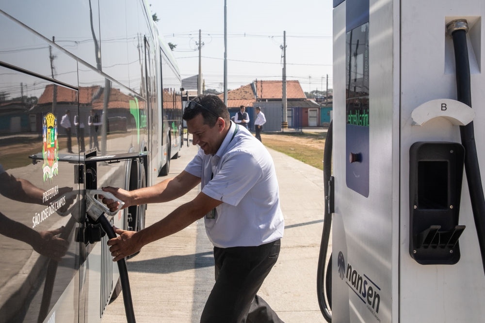 2021年11月,12臺中國制造的純電動鉸鏈?zhǔn)酱蟀驮诎臀骱教斐恰ト魸啥潘箍财账辜冸娍焖俟幌到y(tǒng)投用。這是2023年7月12日,工作人員為中國制造的純電動大巴充電。