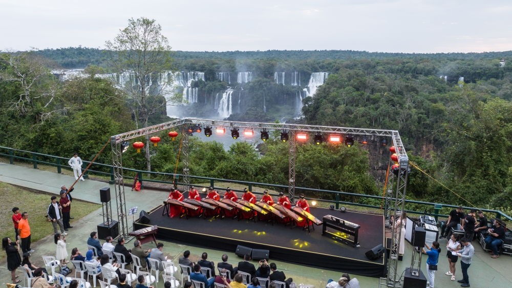 2023年9月29日,演員在巴西伊瓜蘇瀑布前舉行的中秋晚會(huì)上演奏古箏,慶祝中國傳統(tǒng)節(jié)日中秋佳節(jié)。