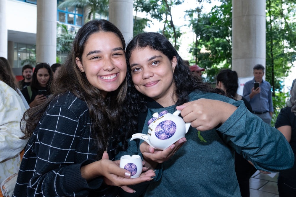 2024年4月18日,在巴西里約熱內(nèi)盧舉行的聯(lián)合國中文日活動(dòng)上,巴西學(xué)生手持中國工藝品合影。
