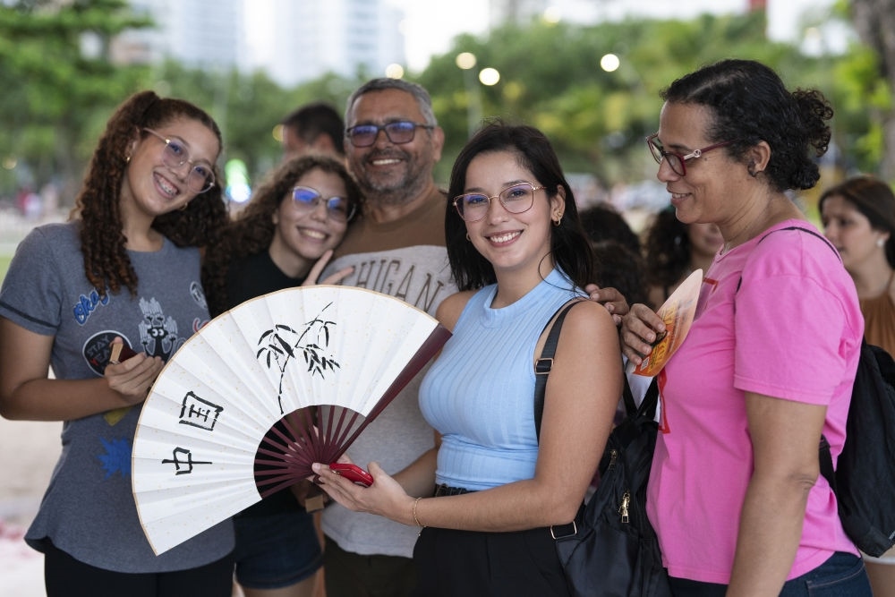 2024年2月3日,一名女子在巴西累西腓舉行的中國春節(jié)慶?;顒?dòng)上展示自己書寫的扇面。