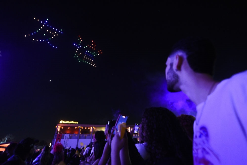 2024年8月17日,在巴西首都巴西利亞,人們?cè)谏碁┧囆g(shù)節(jié)中國日活動(dòng)上觀看無人機(jī)表演。