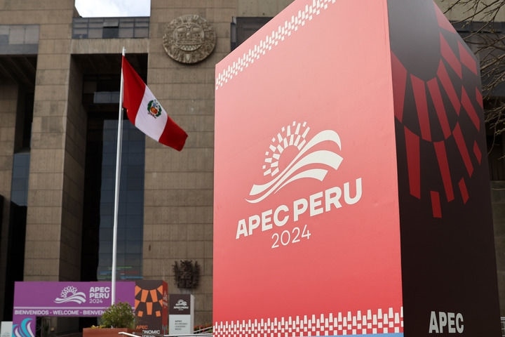 這是2024年11月10日在秘魯首都利馬拍攝的2024年亞太經合組織會議標識。新華社記者 李木子 攝
