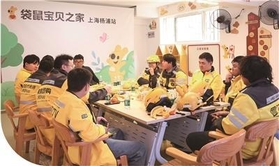 外賣送餐員在楊浦區(qū)殷行街道的騎手驛站參加騎手懇談會(huì)。朱 良攝