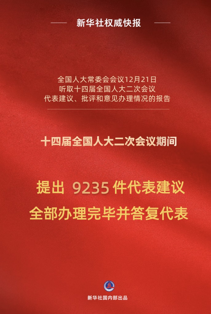 十四屆全國人大常委會(huì)第十三次會(huì)議12月21日聽取全國人大常委會(huì)代表工作委員會(huì)關(guān)于十四屆全國人大二次會(huì)議代表建議、批評(píng)和意見辦理情況的報(bào)告。報(bào)告顯示,今年3月十四屆全國人大二次會(huì)議期間,代表們共提出建議9235件,依法交由213家承辦單位研究辦理。在各有關(guān)方面的共同努力下,已經(jīng)全部辦理完畢并答復(fù)代表。