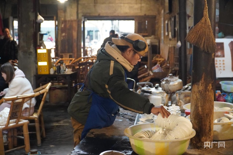 李強正戴著藍布圍裙,在茶館里忙碌(央廣網記者 昌思榮 攝)