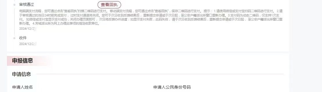 第二步:收到審核通過的短信提示后,使用電腦終端再次登錄北京市政務(wù)服務(wù)網(wǎng)進(jìn)入“個人空間--我的辦件”,點(diǎn)擊“查看回執(zhí)”,使用微信或支付寶掃描二維碼進(jìn)行支付。支付成功后,等待公安機(jī)關(guān)制作證件。