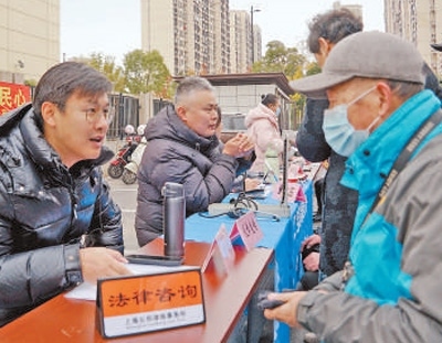 寶山區(qū)新顧城大居拓展區(qū)聯(lián)合黨支部開展便民服務(wù)活動(dòng)。圖為工作人員為居民提供法律咨詢。