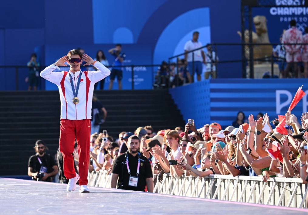 巴黎奧運(yùn)會(huì)跳水男子雙人三米板金牌得主、中國選手龍道一在法國巴黎冠軍公園與觀眾互動(dòng)(2024年8月5日攝)。新華社記者 賀燦鈴 攝