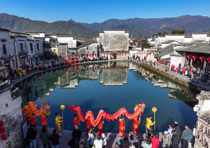 2025年1月18日,民俗表演隊(duì)在安徽省黃山市黟縣宏村巡游(無人機(jī)照片)。新華社發(fā)(施亞磊 攝)