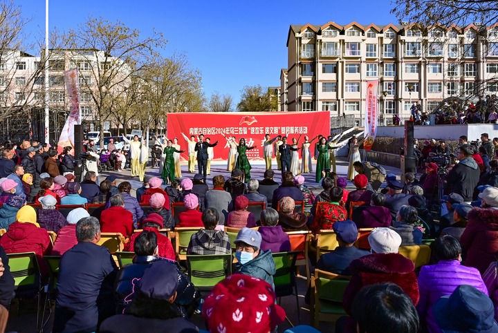 2024年11月21日,在內(nèi)蒙古伊金霍洛旗阿勒騰席熱鎮(zhèn),烏蘭牧騎隊(duì)員表演歌舞節(jié)目。新華社發(fā)(王正攝)