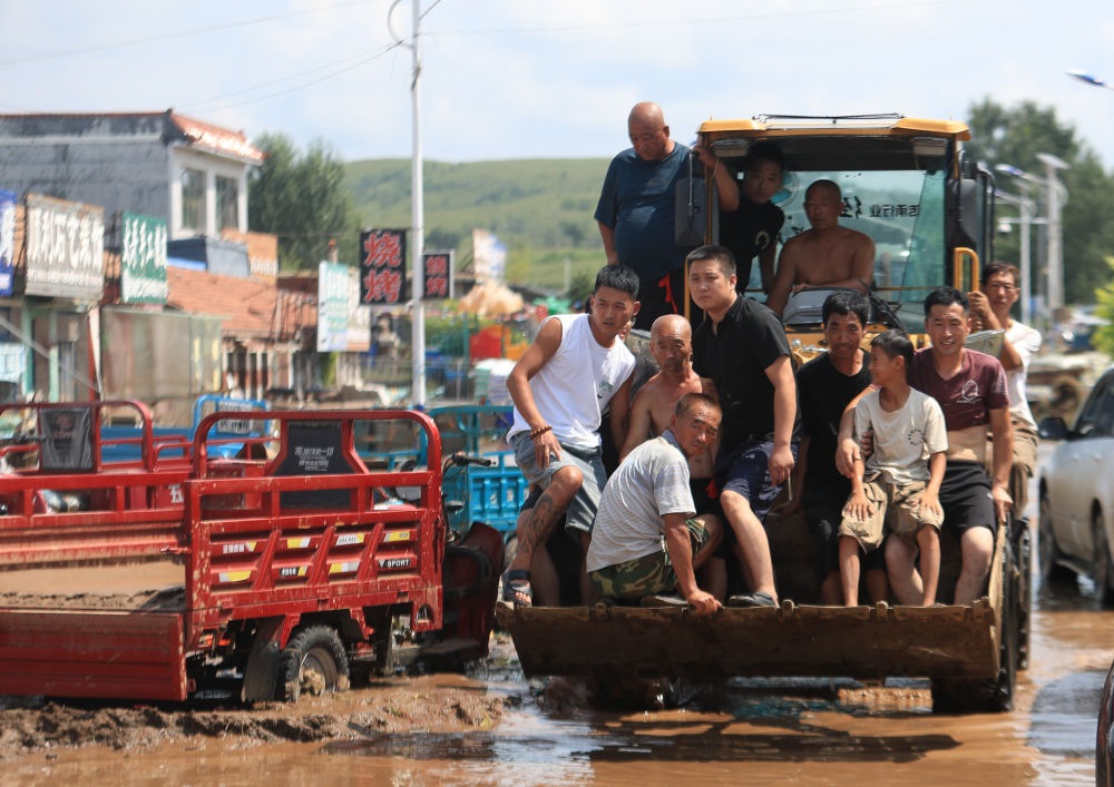 2024年8月21日,葫蘆島市建昌縣部分受災(zāi)居民乘鏟車轉(zhuǎn)移。