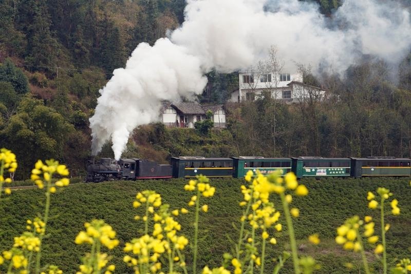 △2025年2月14日,四川樂(lè)山市犍為縣菜子壩景點(diǎn)試種的早季油菜花進(jìn)入盛開(kāi)期,蒸汽小火車穿越油菜花海,吸引不少游客前來(lái)觀看。