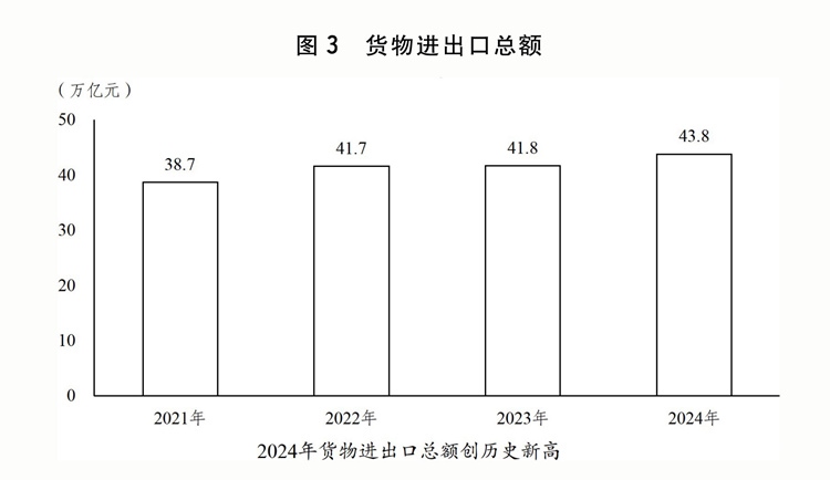 二是外貿(mào)出口對經(jīng)濟(jì)增長貢獻(xiàn)增大。出臺關(guān)于促進(jìn)外貿(mào)穩(wěn)定增長、拓展跨境電商出口推進(jìn)海外倉建設(shè)、推動服務(wù)貿(mào)易和數(shù)字貿(mào)易發(fā)展的政策,貨物和服務(wù)凈出口對經(jīng)濟(jì)增長的貢獻(xiàn)率達(dá)30.3%。進(jìn)博會、廣交會、服貿(mào)會、投洽會、中俄博覽會等重大展會成功舉辦。出臺扎實(shí)推進(jìn)高水平對外開放更大力度吸引和利用外資行動方案。發(fā)布外商投資準(zhǔn)入特別管理措施(負(fù)面清單)(2024年版),制造業(yè)領(lǐng)域外資準(zhǔn)入限制措施全面取消。推進(jìn)服務(wù)業(yè)擴(kuò)大開放綜合試點(diǎn)示范,開展增值電信、生物技術(shù)、獨(dú)資醫(yī)院開放試點(diǎn)。發(fā)布實(shí)施全國版和自貿(mào)試驗(yàn)區(qū)版跨境服務(wù)貿(mào)易負(fù)面清單。推出第八批標(biāo)志性重大外資項(xiàng)目。健全境外投資管理服務(wù)體系。