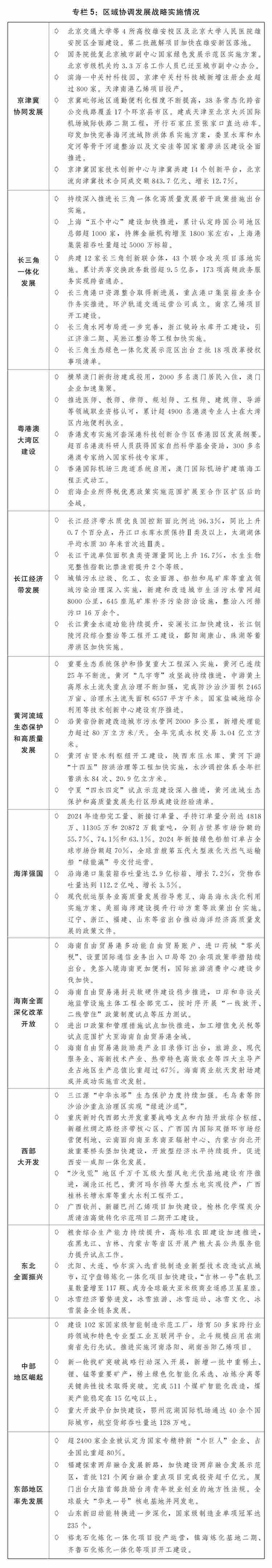 一是區(qū)域協(xié)調(diào)發(fā)展積厚成勢。京津冀協(xié)同發(fā)展走深走實(shí),在京相關(guān)高校、醫(yī)院、中央企業(yè)總部及二三級子公司分批向雄安新區(qū)疏解,北京城市副中心行政辦公、商務(wù)服務(wù)、文化旅游等功能不斷完善,進(jìn)一步支持天津?yàn)I海新區(qū)高質(zhì)量發(fā)展若干政策措施出臺實(shí)施,三省市互聯(lián)互通交通網(wǎng)絡(luò)更加完善、產(chǎn)業(yè)鏈上下游協(xié)作持續(xù)強(qiáng)化、公共服務(wù)共建共享水平進(jìn)一步提升。長三角一體化高質(zhì)量發(fā)展深入推進(jìn),生態(tài)綠色一體化發(fā)展示范區(qū)改革授權(quán)壓茬推進(jìn),港口資源整合、軌道互聯(lián)互通等取得新進(jìn)展,上?!拔鍌€(gè)中心”建設(shè)進(jìn)一步加快?;浉郯拇鬄硡^(qū)建設(shè)邁上新臺階,橫琴粵澳深度合作區(qū)封關(guān)“一線”“二線”分線管理運(yùn)行順利,超1.6萬名澳門居民在合作區(qū)居住生活,支持河套深港科技創(chuàng)新合作區(qū)深圳園區(qū)、香港園區(qū)聯(lián)動發(fā)展,創(chuàng)新要素跨境流動更加便捷。長江經(jīng)濟(jì)帶共抓大保護(hù)、不搞大開發(fā)成效顯著,進(jìn)一步抓實(shí)抓好長江大保護(hù)工作三年行動計(jì)劃出臺實(shí)施,長江十年禁漁取得明顯成效,長江干流連續(xù)5年保持Ⅱ類水質(zhì),綜合立體交通走廊加快構(gòu)建,沿江高鐵全線開工建設(shè)。黃河流域生態(tài)保護(hù)和高質(zhì)量發(fā)展邁出堅(jiān)實(shí)步伐,農(nóng)業(yè)面源、城鎮(zhèn)生活、工業(yè)和尾礦庫污染治理深入推進(jìn),8萬余個(gè)入河排污口開展溯源整治,一批生態(tài)保護(hù)修復(fù)重點(diǎn)項(xiàng)目加快建設(shè),黃河干流連續(xù)3年保持Ⅱ類水質(zhì)。海洋強(qiáng)國建設(shè)深入推進(jìn),海洋強(qiáng)省、現(xiàn)代海洋城市、全國海洋經(jīng)濟(jì)發(fā)展示范區(qū)創(chuàng)新發(fā)展,海洋生態(tài)環(huán)境質(zhì)量持續(xù)改善,海洋生產(chǎn)總值超10萬億元。