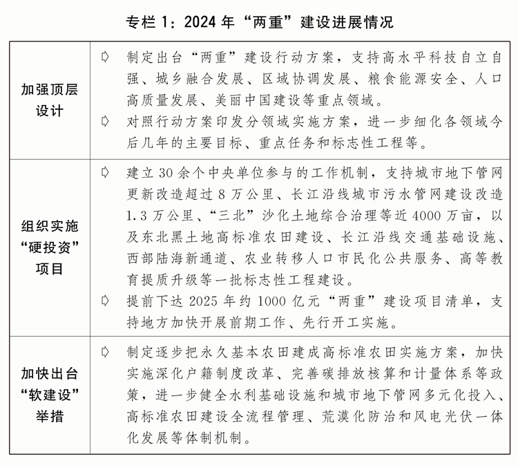 二是發(fā)行超長期特別國債支持“兩重”建設(shè)取得積極進(jìn)展。著眼于系統(tǒng)解決強(qiáng)國建設(shè)、民族復(fù)興進(jìn)程中一些重大項(xiàng)目建設(shè)的資金問題,從2024年起發(fā)行超長期特別國債支持國家重大戰(zhàn)略和重點(diǎn)領(lǐng)域安全能力建設(shè)。堅(jiān)持自上而下、軟硬結(jié)合,建立實(shí)施項(xiàng)目儲備、集中聯(lián)審、??顚S?、強(qiáng)化監(jiān)督等全鏈條推進(jìn)保障機(jī)制。“硬投資”方面,嚴(yán)格做好項(xiàng)目篩選,2024年安排7000億元超長期特別國債支持1465個(gè)重大項(xiàng)目建設(shè),項(xiàng)目基本全部開工、全年完成投資超過1.2萬億元?!败浗ㄔO(shè)”方面,堅(jiān)持項(xiàng)目建設(shè)和配套改革相結(jié)合,扎實(shí)推進(jìn)規(guī)劃編制、政策制定和體制機(jī)制改革創(chuàng)新,不斷完善投入機(jī)制、提高投入效率。規(guī)范項(xiàng)目全過程管理方面,出臺“兩重”建設(shè)有關(guān)管理辦法,督促項(xiàng)目加快開工建設(shè),嚴(yán)格資金監(jiān)管,加強(qiáng)監(jiān)測調(diào)度和現(xiàn)場監(jiān)督檢查,確保建成優(yōu)質(zhì)工程、精品工程、放心工程。