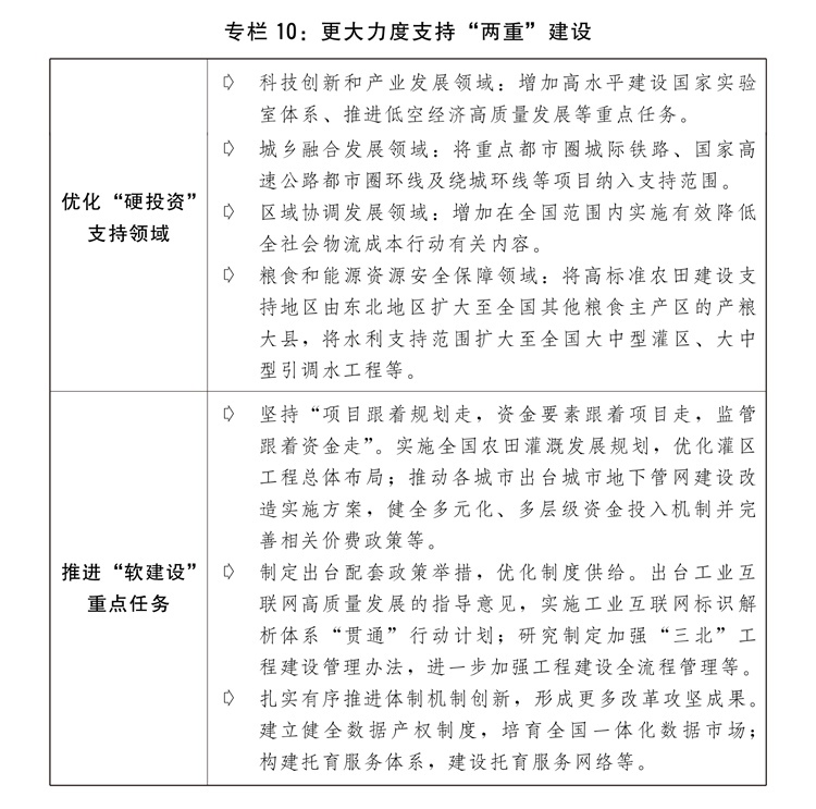 三是加力推進(jìn)“兩重”建設(shè)。進(jìn)一步完善自上而下的工作機(jī)制,加強(qiáng)“兩重”建設(shè)項(xiàng)目儲備,更好統(tǒng)籌“硬投資”與“軟建設(shè)”。安排超長期特別國債8000億元支持“兩重”建設(shè),進(jìn)一步優(yōu)化具體投向并提高項(xiàng)目支持比例,重點(diǎn)支持基礎(chǔ)研究能力提升、未來產(chǎn)業(yè)發(fā)展、東北等重點(diǎn)地區(qū)高標(biāo)準(zhǔn)農(nóng)田建設(shè)、大中型灌區(qū)新建改造及大中型引調(diào)水和大中型水庫建設(shè)、長江經(jīng)濟(jì)帶生態(tài)環(huán)境保護(hù)和綠色發(fā)展、農(nóng)業(yè)轉(zhuǎn)移人口市民化公共服務(wù)體系建設(shè)、高等教育提質(zhì)升級、城市地下管網(wǎng)管廊建設(shè)改造等方面任務(wù),強(qiáng)化超長期貸款等配套融資,高質(zhì)量推進(jìn)“硬投資”項(xiàng)目謀劃實(shí)施。加大力度推動“軟建設(shè)”政策落地見效。