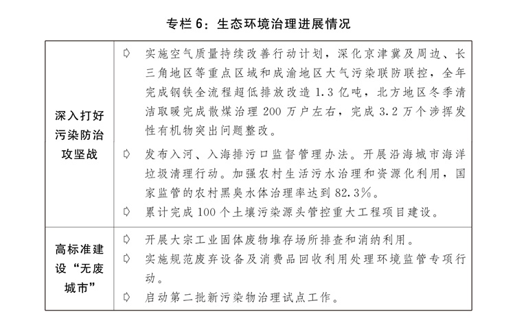 (九)堅(jiān)定不移推進(jìn)生態(tài)文明建設(shè),全面綠色轉(zhuǎn)型取得積極進(jìn)展。出臺加快經(jīng)濟(jì)社會發(fā)展全面綠色轉(zhuǎn)型的意見,持續(xù)深入打好污染防治攻堅(jiān)戰(zhàn),積極穩(wěn)妥推進(jìn)碳達(dá)峰碳中和,大力實(shí)施全面節(jié)約戰(zhàn)略,美麗中國建設(shè)成效明顯。
