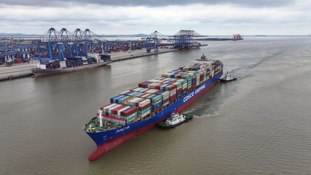 2024年5月19日,一艘海輪在廣西欽州港碼頭靠泊(無人機(jī)照片)。欽州港是北部灣港的組成部分,也是中國西南地區(qū)通往東盟的重要出???。西部陸海新通道利用鐵路、公路、水運等多種運輸方式,由重慶一路向南,經(jīng)廣西北部灣出海通達(dá)世界各地。截至2025年1月1日,北部灣港總航線達(dá)80條,其中外貿(mào)航線49條,基本實現(xiàn)國內(nèi)主要港口和東南亞、東北亞主要港口全覆蓋。