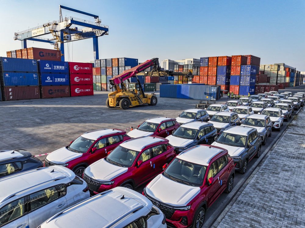 2024年10月28日在重慶國際物流樞紐園區(qū)西部陸海新通道重慶無水港拍攝的出口汽車裝運現(xiàn)場(無人機(jī)照片)。位于重慶市沙坪壩區(qū)的重慶國際物流樞紐園區(qū),是重慶中歐班列、西部陸海新通道班列、渝滿俄班列、渝甬班列的主要到發(fā)點,截至2024年10月,已開通班列線路62條,輻射125個國家和地區(qū)的542個港口。