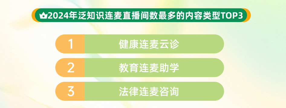 隨著用戶互動與創(chuàng)作者投稿形成正向循環(huán),推動生態(tài)雙向繁榮,連麥學習正重塑知識普惠的全新范式。數(shù)據(jù)顯示,2024年,快手泛知識連麥直播場次達491萬場,直播間互動量同比提升23%,健康咨詢、教育助學、法律咨詢位列連麥內(nèi)容前三?! ?/p>