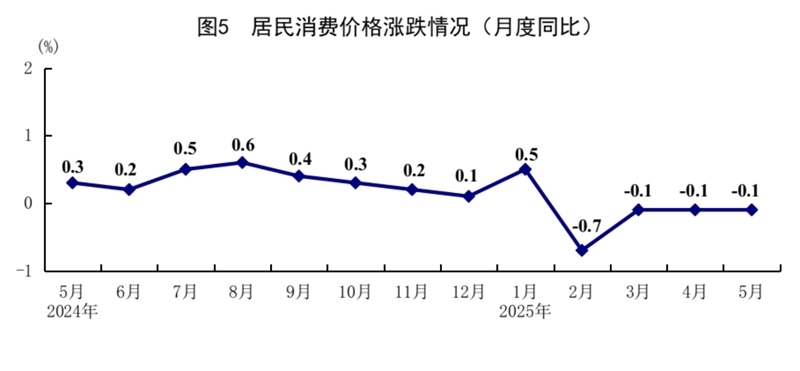 5月份,全國居民消費價格(CPI)同比下降0.1%,環(huán)比下降0.2%。分類別看,食品煙酒價格同比上漲0.1%,衣著價格上漲1.5%,居住價格上漲0.1%,生活用品及服務(wù)價格上漲0.1%,交通通信價格下降4.3%,教育文化娛樂價格上漲0.9%,醫(yī)療保健價格上漲0.3%,其他用品及服務(wù)價格上漲7.3%。在食品煙酒價格中,鮮菜價格下降8.3%,糧食價格下降1.4%,豬肉價格上漲3.1%,鮮果價格上漲5.5%。扣除食品和能源價格后的核心CPI同比上漲0.6%,漲幅比上月擴大0.1個百分點。1—5月份,全國居民消費價格同比下降0.1%。