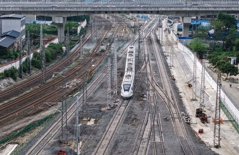 6月19日,在成渝中線高鐵成都站南北站場交替施工現(xiàn)場,中鐵八局施工人員在拆除原來的軌道和枕木,上方中國中鐵電氣化局的施工人員在進行接觸網(wǎng)施工作業(yè)。