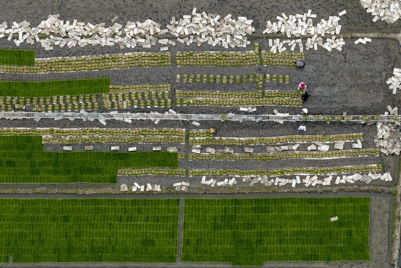 6月19日,在江蘇省連云港市東海縣張灣鄉(xiāng)張灣村秧板田里,農(nóng)民起水稻秧苗準(zhǔn)備進(jìn)行機(jī)插作業(yè)(無(wú)人機(jī)照片)。