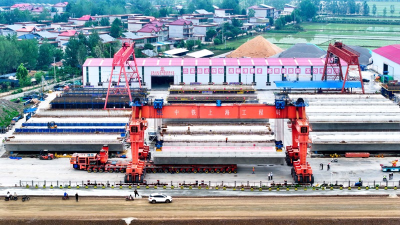 6月21日,在濰宿高鐵中鐵上海局郯城制梁場(chǎng),提梁機(jī)在提運(yùn)箱梁(無人機(jī)照片)。