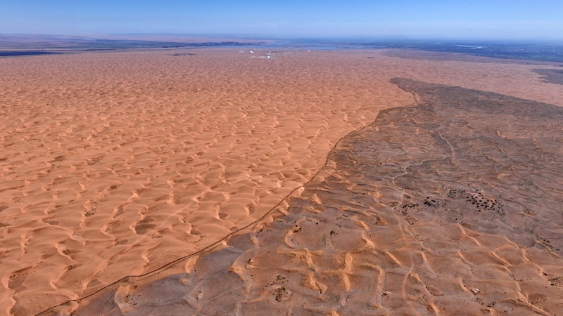 這是6月30日在寧夏中衛(wèi)市長流水村拍攝的騰格里沙漠東南緣治沙鎖邊工程現(xiàn)場(無人機(jī)照片)。