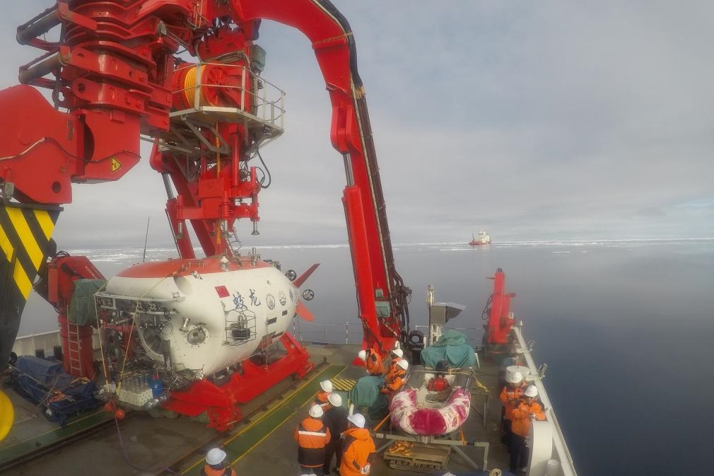 “蛟龍”號在北冰洋進行首次下潛,“雪龍2”號提供保障支持。新華社記者 劉詩平 攝