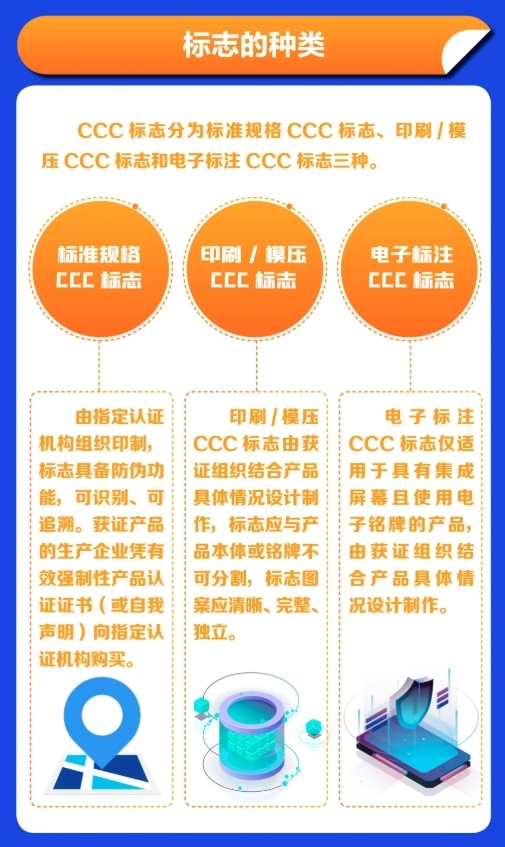 這份解讀明確,CCC標(biāo)志分為標(biāo)準(zhǔn)規(guī)格CCC標(biāo)志、印刷/模壓CCC標(biāo)志和電子標(biāo)注CCC標(biāo)志三種。其中的標(biāo)準(zhǔn)規(guī)格CCC標(biāo)志由指定認(rèn)證機構(gòu)組織印制,標(biāo)志具備防偽功能,可識別、可追溯。獲證產(chǎn)品的生產(chǎn)企業(yè)憑有效強制性產(chǎn)品認(rèn)證證書(或自我聲明)向指定認(rèn)證機構(gòu)購買。