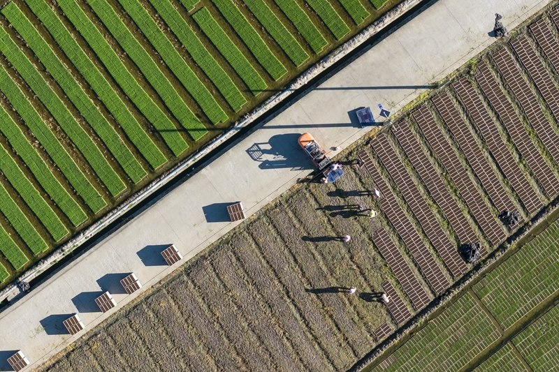 7月7日,浙江省余姚市黃家埠鎮(zhèn)上塘村農(nóng)民在田間擺放晚稻秧盤(無人機(jī)照片)。