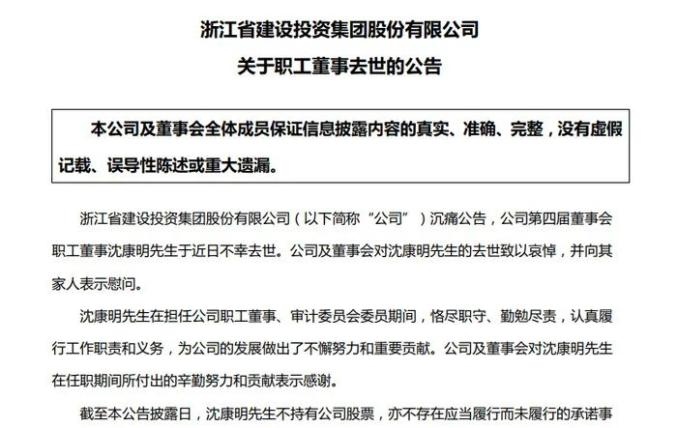 浙江省建設(shè)投資集團(tuán)股份有限公司(下稱(chēng)“浙江建投”)(002761.SZ)于7月3日公告稱(chēng),集團(tuán)職工董事沈康明于近日不幸去世,年僅54歲。