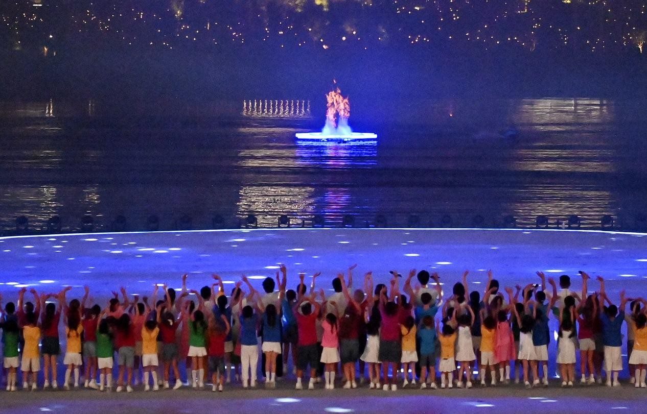 宣布開幕瞬間,象征世運會會徽和“World”的“W”造型焰火點亮夜空;極具創(chuàng)意和挑戰(zhàn)的點火儀式,火炬“竹夢”成功點燃世運會首個“水火相融”于湖中的火炬塔,絢爛的火焰交相輝映。