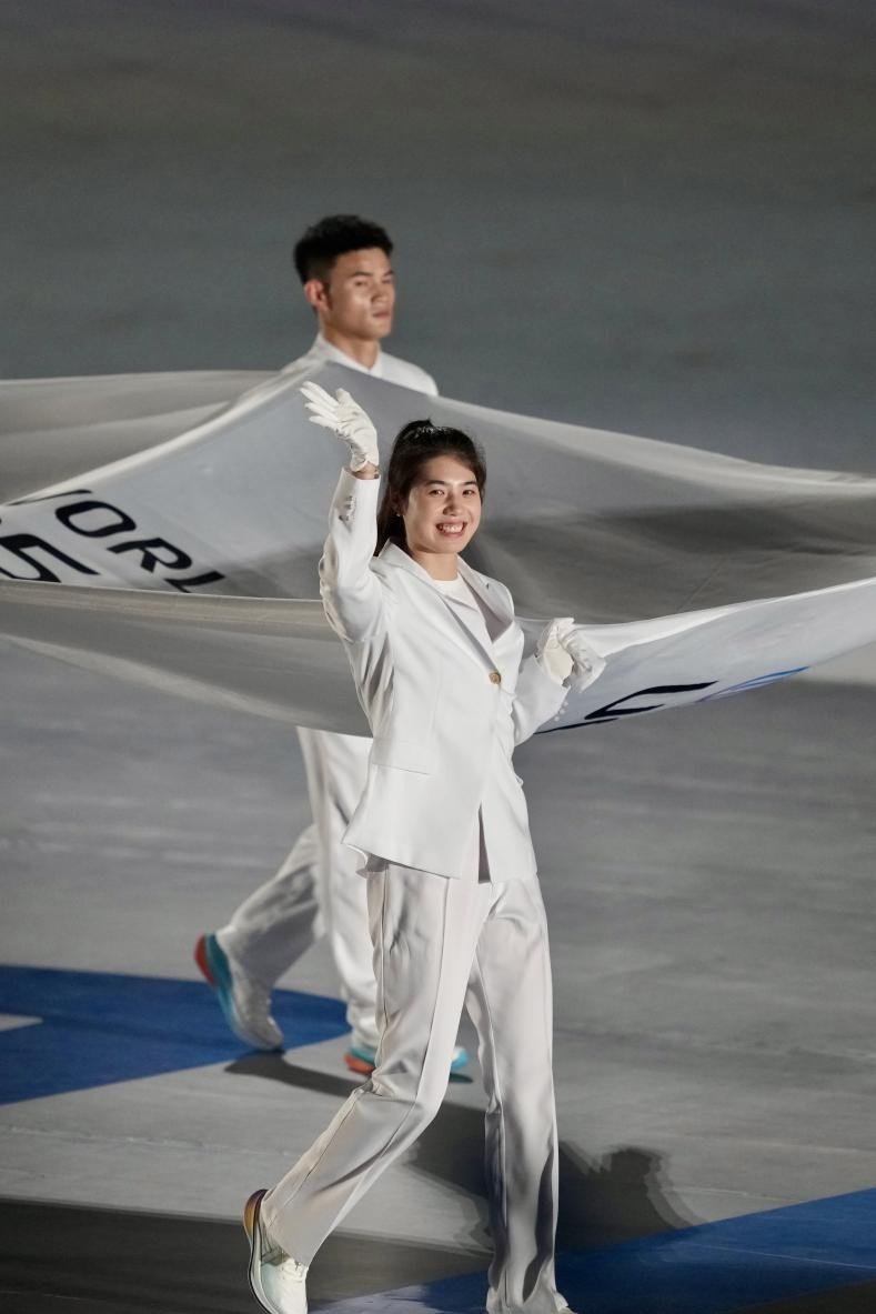 開幕式在《繽紛之約》表演中拉開序幕,街舞與輪滑、滑板、啦啦操等運動元素碰撞出青春火花激情開場。倒計時焰火組成的篆體“成都”字樣,將傳統(tǒng)文化與現代科技巧妙結合。來自全球的運動員在吉祥物“蜀寶”“錦仔”的歡迎下入場,手持融入蜀繡、漆藝等非遺工藝的引導牌,踏上榮耀之路。