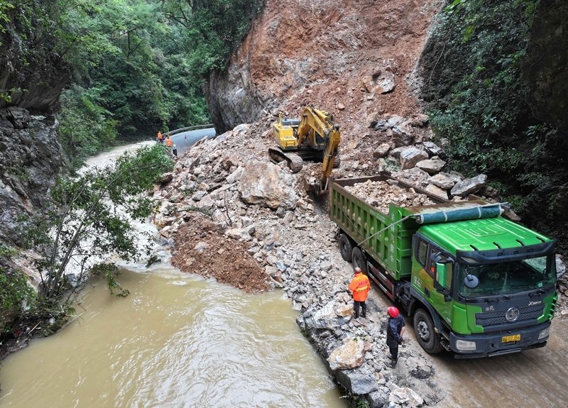 8月10日,在468省道??悼h寺坪鎮(zhèn)升石坪路段,公路養(yǎng)護(hù)部門工作人員駕駛裝載機(jī)處置路旁垮方。