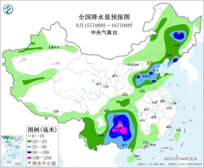 8月15日08時(shí)至16日08時(shí),貴州、廣西西部和北部、湖南西部、四川盆地東南部、重慶南部和黑龍江南部、吉林北部、遼寧南部、華北中南部、山東北部等地部分地區(qū)有中到大雨,其中,貴州大部、廣西北部和黑龍江西南部、吉林北部、遼寧東南部、山西東部、河北東南部、山東西部、重慶東南部等地部分地區(qū)有暴雨或大暴雨(100~200毫米)。