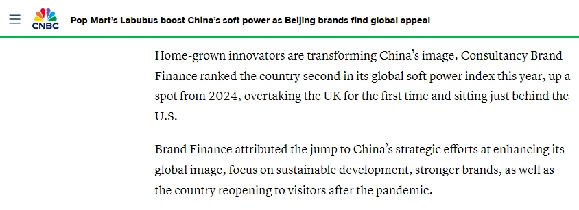 文章說(shuō),英國(guó)“品牌金融”咨詢公司今年發(fā)布的全球軟實(shí)力指數(shù)顯示,中國(guó)排名升至全球第二——較2024年上升一位,首次超越英國(guó),目前僅次于美國(guó)。該公司分析認(rèn)為,中國(guó)軟實(shí)力躍升的重要原因在于中國(guó)提升國(guó)際形象的戰(zhàn)略性舉措、對(duì)可持續(xù)發(fā)展的堅(jiān)定投入、日益增強(qiáng)的品牌實(shí)力,以及向全球游客敞開國(guó)門。消費(fèi)分析師認(rèn)為,經(jīng)過(guò)這些努力,人們終于能穿透貼在中國(guó)產(chǎn)品身上的負(fù)面濾鏡,看清產(chǎn)品的真正價(jià)值,逐漸擺脫過(guò)去對(duì)“中國(guó)制造”的刻板偏見(jiàn)。