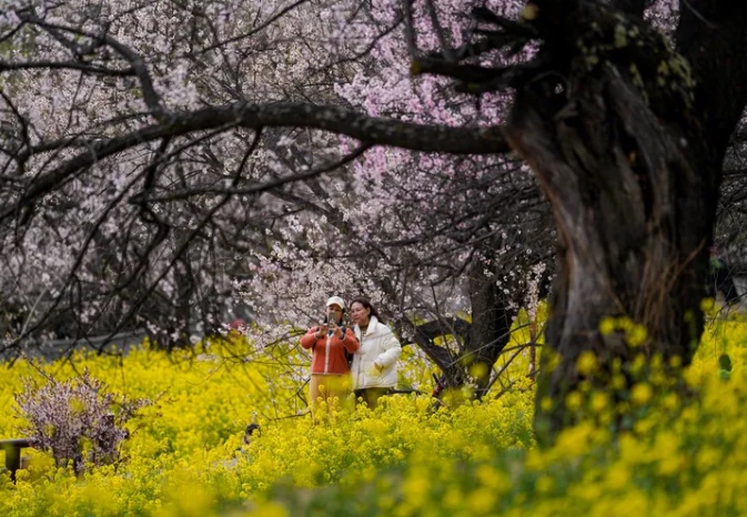 游客在西藏林芝市嘎拉村賞花(2025年4月2日攝)。新華社記者 晉美多吉 攝