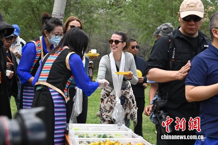 2025年6月5日,105位境外游客組成的國際旅行商考察團走進西藏山南市瓊結縣強吉村。他們參觀古建活化項目,觀看非遺展演,體驗鄉(xiāng)村露營。 中新社記者 貢嘎來松 攝