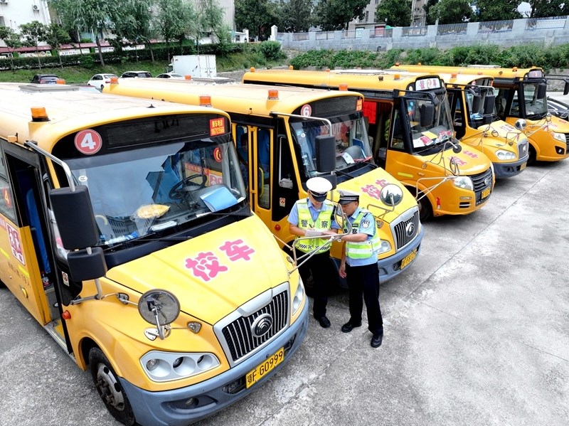 8月25日,湖北省襄陽市??悼h公安局交警大隊民警對校車進行安全檢查(無人機照片)。