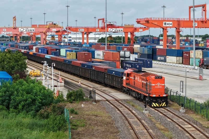 8月27日,貨運(yùn)列車駛?cè)胛挥谏虾鲜痉秴^(qū)內(nèi)的中國(guó)-上海合作組織地方經(jīng)貿(mào)合作示范區(qū)多式聯(lián)運(yùn)中心(無(wú)人機(jī)照片)。