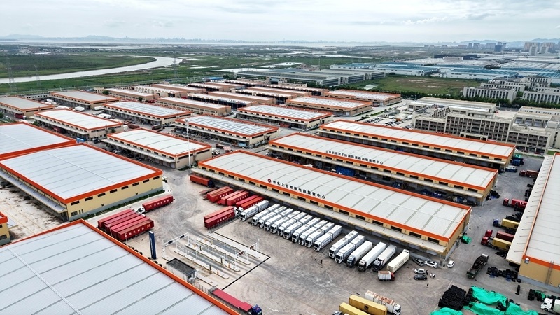 這是位于青島膠州市的中國(guó)傳化(上合)國(guó)際物流港。該物流港集智能倉(cāng)儲(chǔ)、零擔(dān)分撥、多式聯(lián)運(yùn)等功能于一體(8月27日攝,無(wú)人機(jī)照片)。